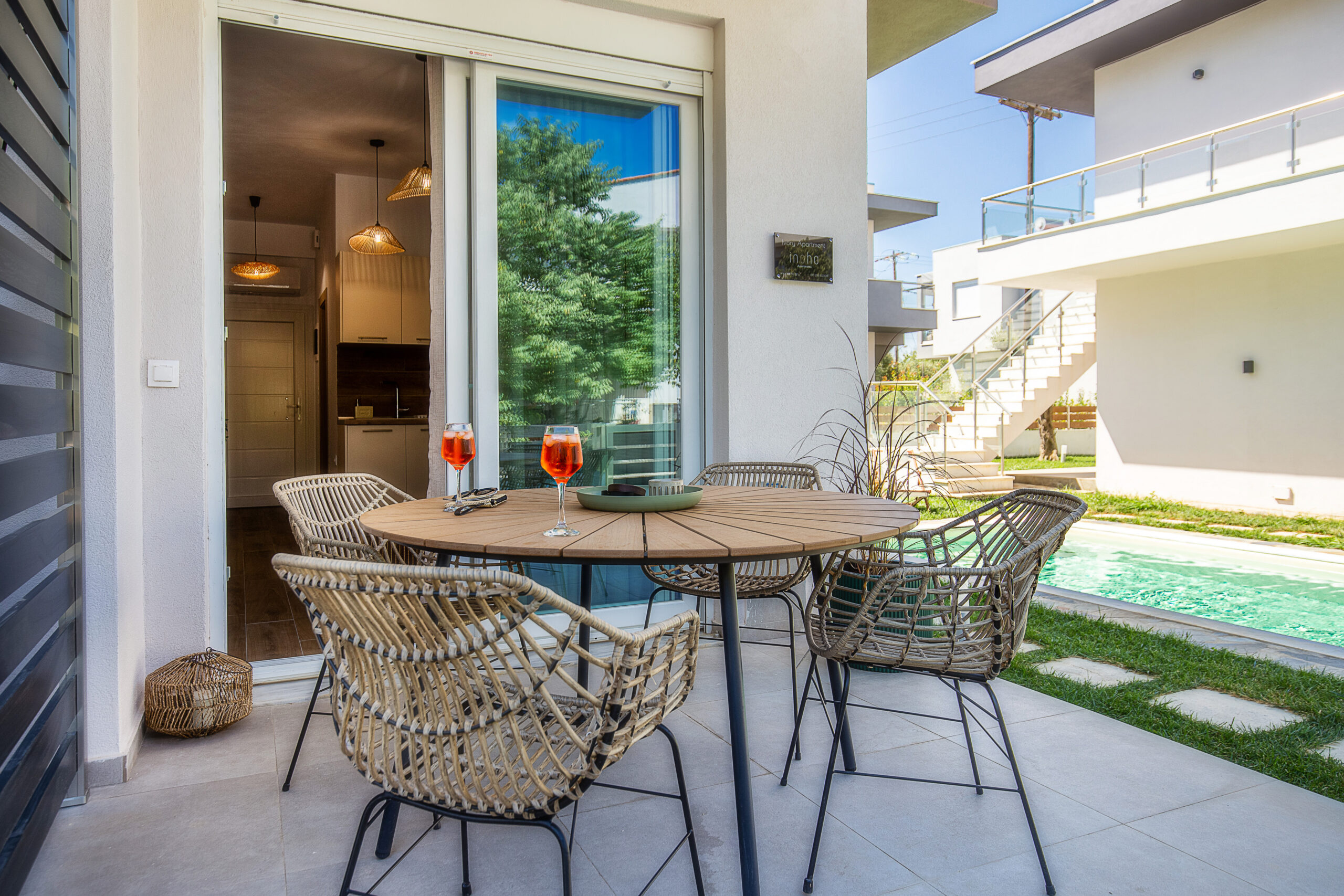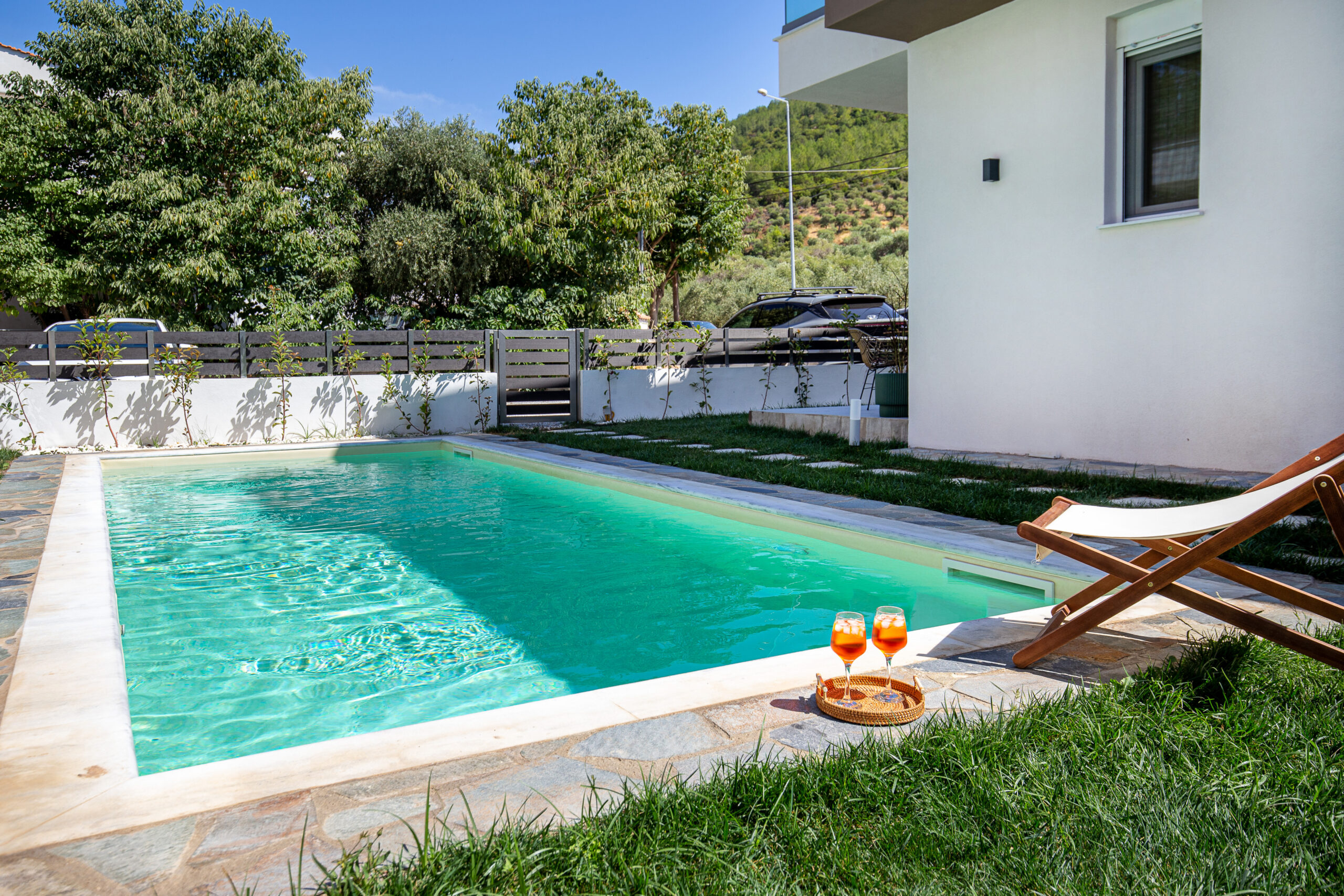 Στον προαύλιο χώρο του συγκροτήματος θα βρείτε μια όμορφη κοινόχρηστη πισίνα, ιδανική για στιγμές δροσιάς και ξεκούρασης μετά από την παραλία. Ο χώρος αυτός συμπληρώνει ιδανικά την εμπειρία διαμονής, προσφέροντας στιγμές ηρεμίας.